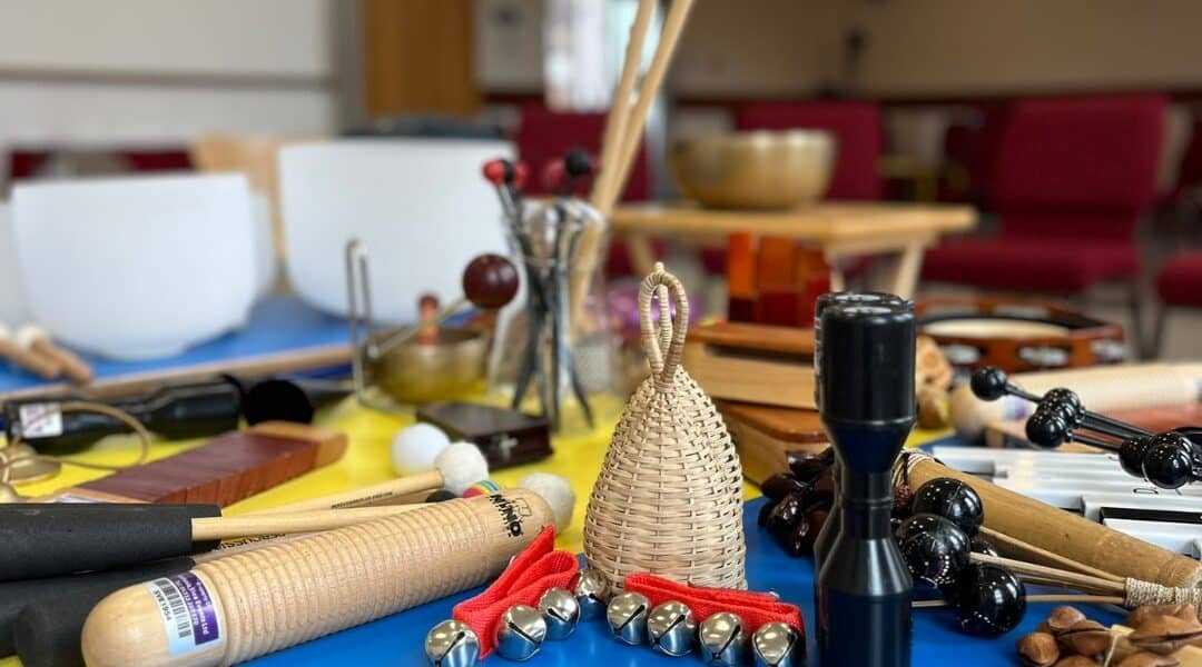 Our themes for the sessions were ‘Wheels, Water and Weaving’, taking inspiration from Derby’s industrial past, and we worked as a whole group to create improvisational soundscapes based around these elements. Participants enjoyed the opportunity to explore a wide range of handheld percussion, including a few unusual instruments: the glass singing bowls, with their satisfying resonant sound, proved a particularly big hit! We took cues from individuals to build our sound worlds but left space for experimentation and play: there was no such thing as a wrong note here, and we saw lots of new playing styles and creative ideas emerge over the three sessions!